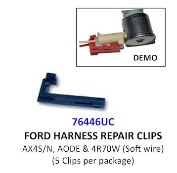 "Harness Repair Clips" are used to fix broken connectors on a transmission harness. Simply slip a "Repair Clip" over the broken plug and it's fixed. Fits: AX4S, AX4N, AODE, and 4R70W (Softwire)