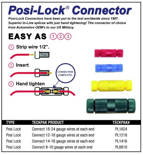 POSI-LOCK Connector 14-16 Gauge Wire 10 Connectors per package Strip, thread, and tighten. Secure wire connections are just that easy when you use our Posi-Lock connectors. There's no crimping involved--just strip the wire, thread it through one end of the connector, and hand tighten the other end. The whole process takes just seconds, but the connection lasts darn near forever. These connectors won't pull apart, vibrate loose, or melt down in temperatures up to 482 degrees F. They're stronger than crimping, weather and chemical resistant, and completely reusable.